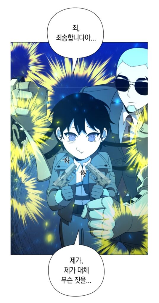 진짜 어지간해선 이렇게 심하게 얘기 안하겠는데 아래의 장면이 진지한 전투장면 중 나와야 할 프로의 그림인가? 표정, 이펙트, 캐릭터 비율, 모델링을 그대로 갖다 써서 위화감을 잔뜩 발생시키는 총기, 얼굴 표정과 대사 매치까지 단 하나도 멀쩡한 게 없다. 근래들어 본 웹툰 중 최악의 장면을 꼽는다면 주저 없이 이 장면을 꼽을 수 있을 정도이다.